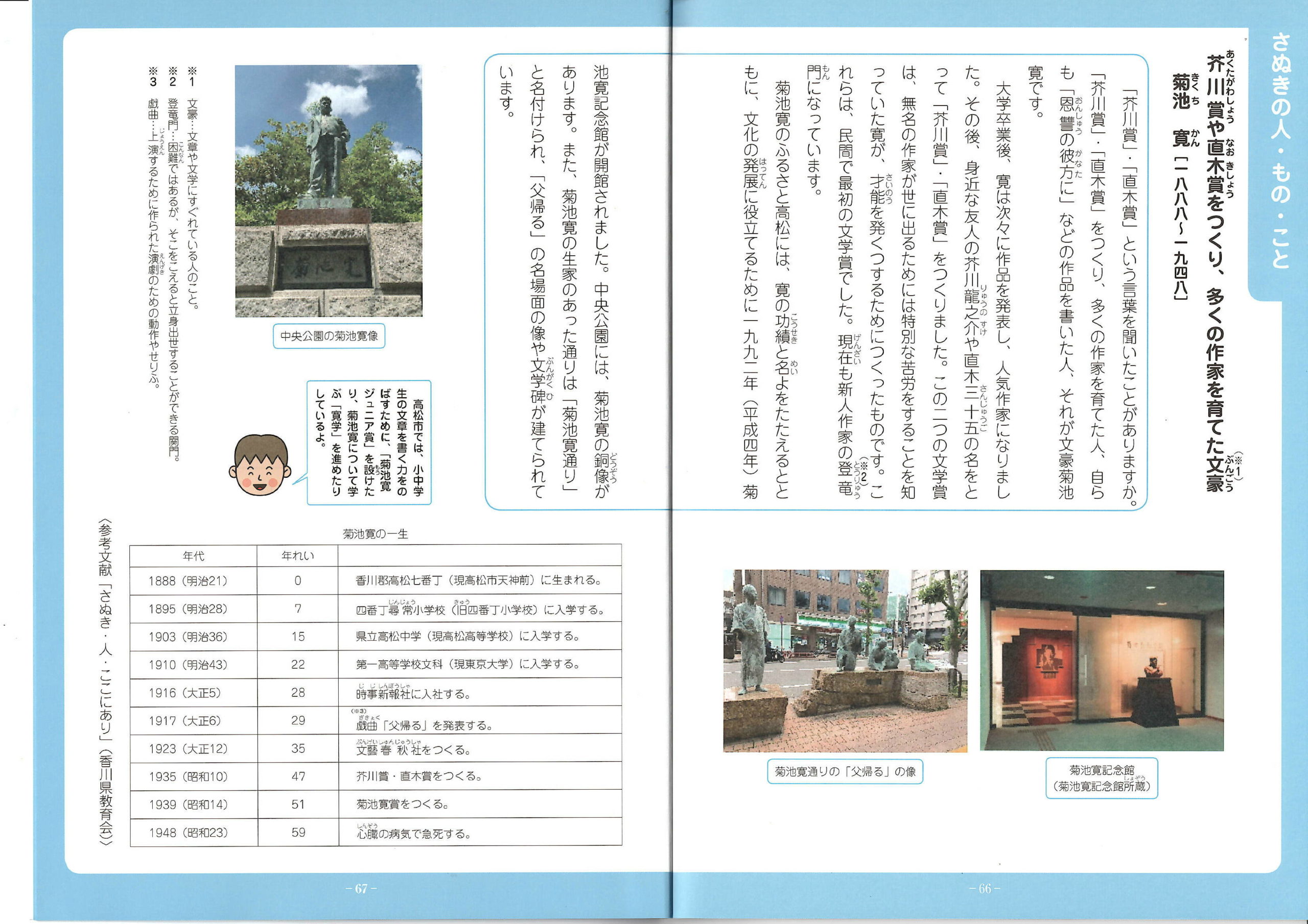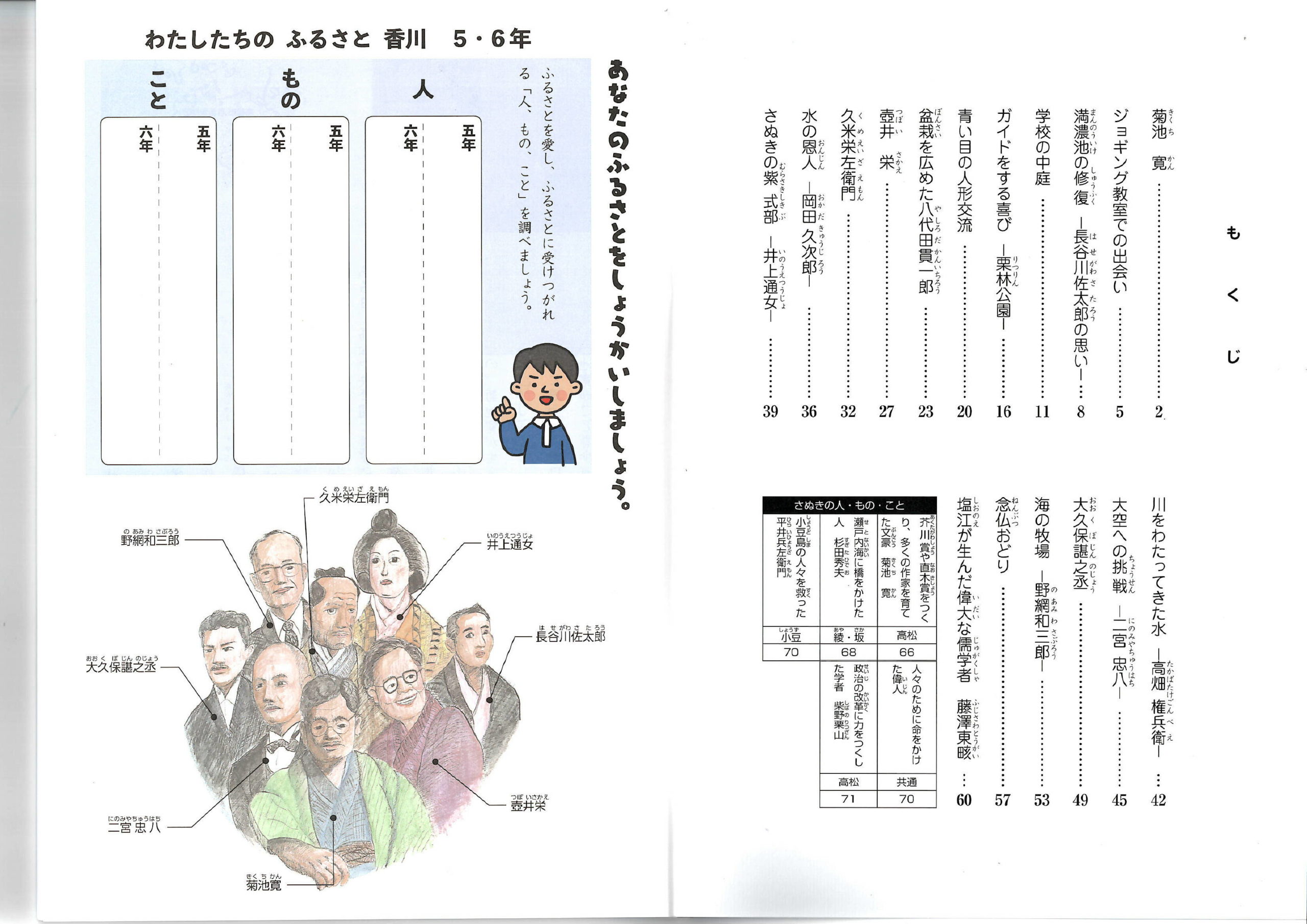 香道研作成教材 X Facebook はてブ Pocket LINE コピー 2021.12.282024.01.10 表紙 目次 さぬきの人・もの・こと 香川県独自の郷土教材「わたしたちのふるさと香川」(1・2年、3・4年、5・6年の3種類)を発行しました。 郷土の偉人や行事などから、教材を作成し、掲載しています。道徳の授業はもちろん、社会や総合的な学習の時間でも活用しています。 また、本年度の改訂からは、「さぬきの人・もの・こと」というページを作成し、絵や写真、短い文章から、簡単に郷土について学ぶことができるようになりました。